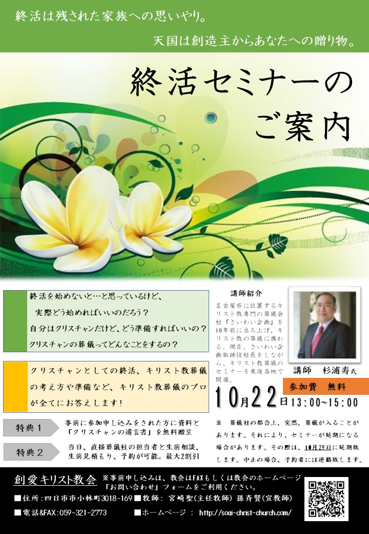いつかは訪れるその時に備えませんか。クリスチャンとしての最期をどの様に準備すればよいのか。キリスト教葬儀を家族にも理解してほしい。今は、クリスチャンじゃないけど、キリスト教葬儀について気になっている…そんな方にお勧めです。どなたでもご参加頂けます。また、ご参加された方に、資料と合わせて「クリスチャン用の遺言状」を贈呈致します。一部は教会に提出し、一部がご自分で保管して、いつか訪れるその時に備えませんか。参加は無料です。資料などの印刷物準備のために、創愛キリスト教会ではない教会からのご参加の方は、参加人数をお知らせ頂けますなら感謝です。参加申し込みは教会のお問い合わせフォームや、ファックスなどをご利用ください。