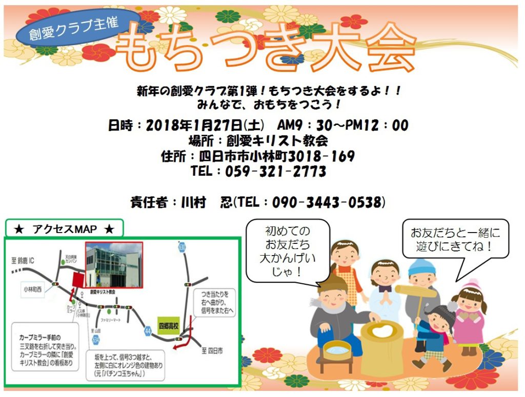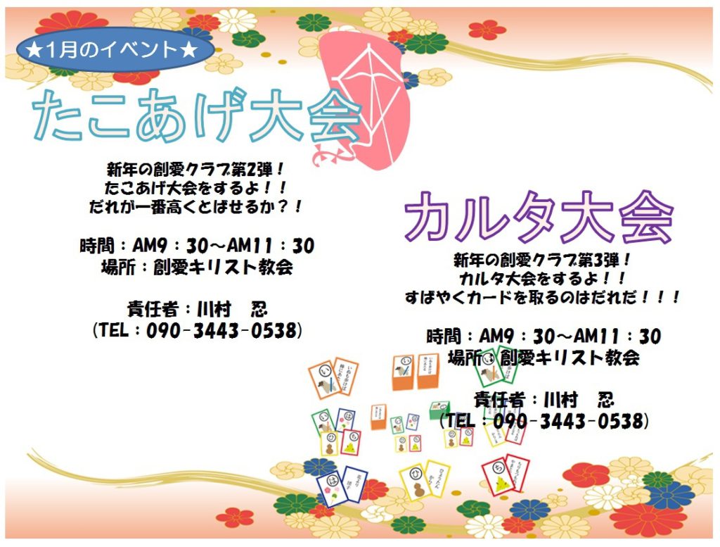 毎週土曜日9時半から11時半まで開催されております、子供クラブの創愛クラブですが、2018年は1月13日よりスタートします。天候が寒い季節ですが、天候が良ければ13日はタコあげをしたいと思います。8000坪の敷地内に電信柱はありませんので、思いっきりタコを飛ばしましょう!でも、もし天候が悪かったり風が吹いていなければ、かるた大会へと変更させて頂きます。また、次週の1月20日には、かるた大会を予定しております(もし13日にかるた大会になれば、この日はたこ上げ大会となります。)。そして、1月27日には、お待ちかねのお餅つきです。どのイベントも無料ですので、どなた様もふるってご参加ください。お待ちしております。